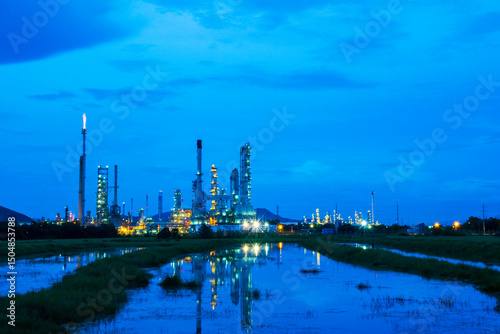 Naklejka premium Oil refinery gas petrol plant industry with crude tank, gasoline supply and chemical factory. Petroleum barrel fuel heavy industry oil refinery manufacturing factory plant. Refinery industry concept