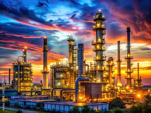 Fototapeta premium "Oil Refinery Illuminated at Dusk: A Urban Exploration"