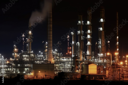 Fototapeta premium Oil refinery illuminated at night, with numerous pipelines and storage tanks depicting fossil fuel industry, generative ai