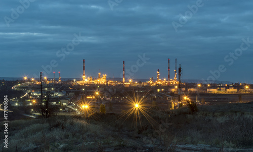 Obraz premium Oil refinery in the evening, under artificial lighting