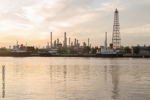 © funfunphoto, Naklejka premium Oil refinery industry plant at dusk.