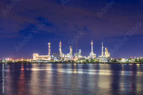 © wirojsid, Fototapeta premium Oil refinery on water front at night