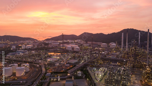 © Yellow Boat, Fototapeta premium Oil Refinery plant at sunset. Gas Chemical Equipment Prodiction import export Concept, Crude Oil Refinery Plant Steel Pump Pipe line and Chimney and Cooling tower, Chemical Petrochemical