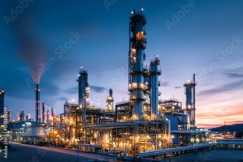 © Serhii, Naklejka premium Oil Refinery Plant Emitting Light Smoke at Dawn