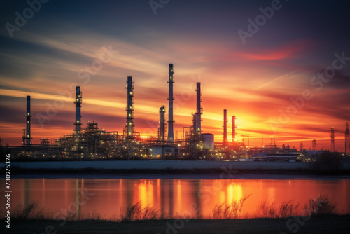 Naklejka premium Oil refinery plant. Gas Processing Plant. Pipes of natural gas factory. Oil crude and gas refineries. Oil refining and Petrochemical. Reduced fuel. Ai Generated Illustration.