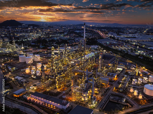 Obraz premium Oil refinery plant industry factory zone, oil and gas petrochemical industrial, oil storage tank and pipeline steel, twilight scene and over lighting equipment and the sunset and cloud sky background,