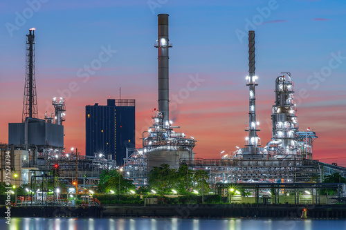 © Chatchawal, Naklejka premium Oil refinery reflected along with river during twilight