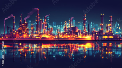 © Thiago, Naklejka premium Oil refinery terminal. power energy industry. oil refinery factory with electric lights. gas and oil refinery industrial complex with pipelines. Electric Harbor. Illustration