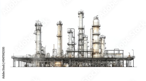 Obraz premium Oil refinery with distillation columns and metal walkways, isolated on white background
