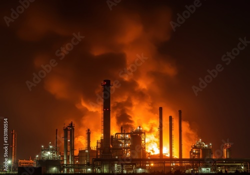 © PNG Stock, Obraz premium Oil refinery with large fire and smoke plumes at night