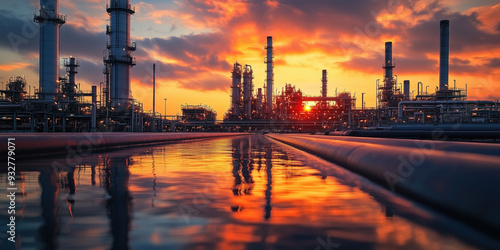 © Old Man Stocker, Fototapeta premium Oil refinery with reflective pipelines at sunset. Oil refinery at sunset with pipelines reflecting the vibrant colors of the sky, highlighting the scale and complexity of the infrastructure.