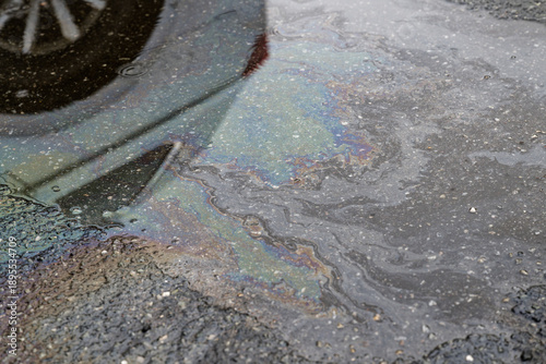 © Holger, Naklejka premium Oil sheen rainbow pattern floating on puddle on asphalt road