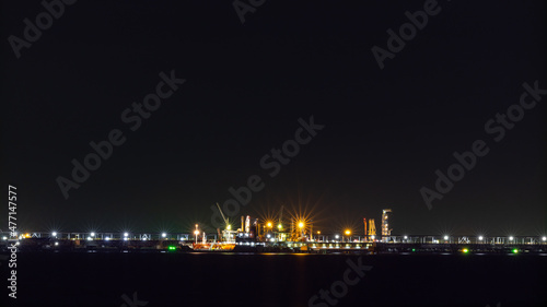 © SHUTTER DIN, Fototapeta premium Oil ship tanker loading oil at the oil brige on the sea from refinery for transportation. at night over lighting in Thailand