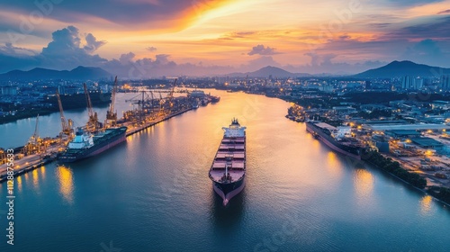 © MAGNIFIER, Fototapeta premium oil tanker, gas tanker in the high sea.Refinery Industry cargo ship. top view,aerial view,Thailand, in import export, LPG,oil refinery, Logistics and transportation with working crane bridge in harbor