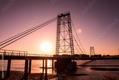 Fototapeta premium Oilfield pipeline bridge in sunset background