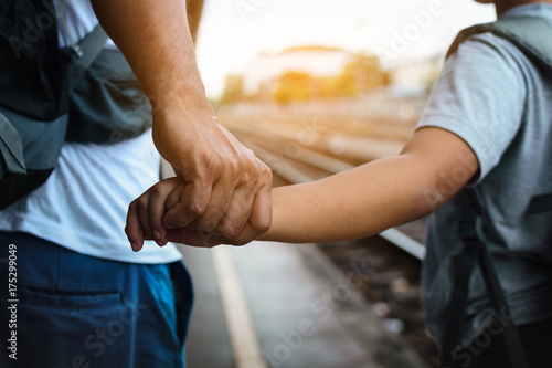 Fototapeta premium Ojciec i syn plecak i trzymając się za ręce na stacji kolejowej w Tajlandii