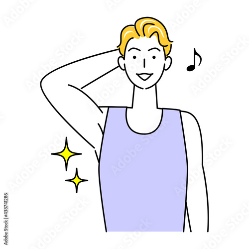 © みやもとかずみ, Obraz premium ボディケアの効果でキラキラしている綺麗な脇の下を見せている笑顔の可愛い男性 OK イラスト シンプル ベクター