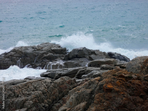 © Jorge, Fototapeta premium Olas estrellándose contra las rocas y generando espuma
