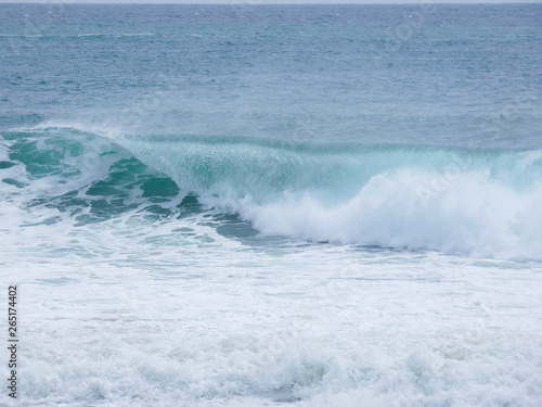 © Jorge, Fototapeta premium Olas rompiendo en la playa y surfistas esperando la Ola para cabalgarla