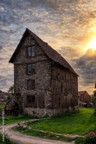 © Evgenii, Obraz premium Old abandoned building with a water mill in the countryside. Generative AI