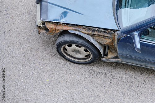 Naklejka premium Old abandoned car on the street without a body element with rust