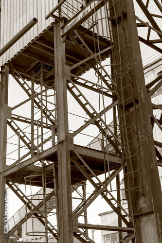 Naklejka premium Old, abandoned concrete plant with iron rusty tanks and metal structures. The...