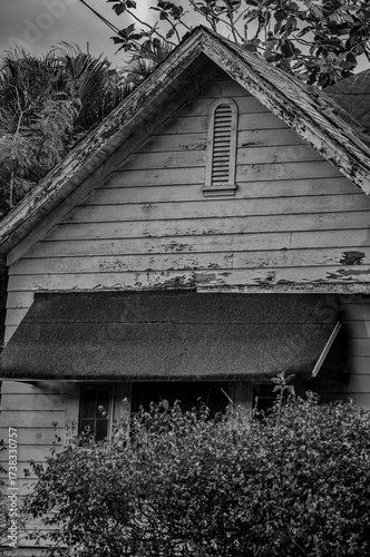 © ttrimmer, Obraz premium Old Abandoned House with an Attic and a Steep Roof in Black and White.