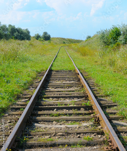Obraz premium Old abandoned railway tracks disappearing into the distance among green fields