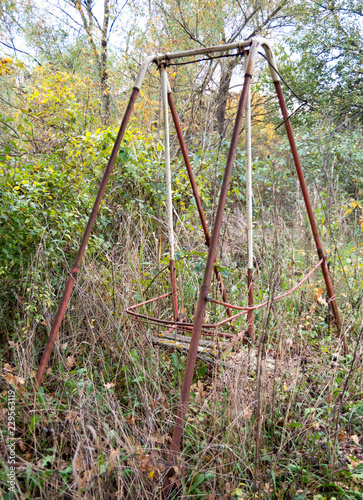 © Vasily Popov, Fototapeta premium Old abandoned rusty swing among grass and trees
