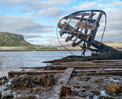 © Sofiia, Fototapeta premium old abandoned sunken ship in the water at the ship cemetery