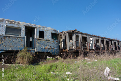 Fototapeta premium Old abandoned trains in sunny day