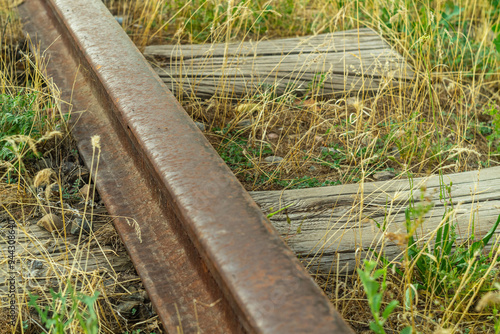 Fototapeta premium Old abandoned, unused railway line is falling into oblivion. Due to lack of maintenance, driving, the embankment is overgrown with wild grass, the sleepers are turning into dust, rails are corroding.