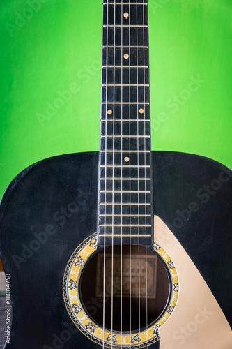 Fototapeta premium old acoustic guitar on green paint wall background - vintage grunge style