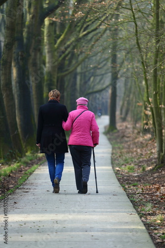 © bestjeroen, Fototapeta premium "old age"/ old lady with walking stick walking through the woods with care taker early spring