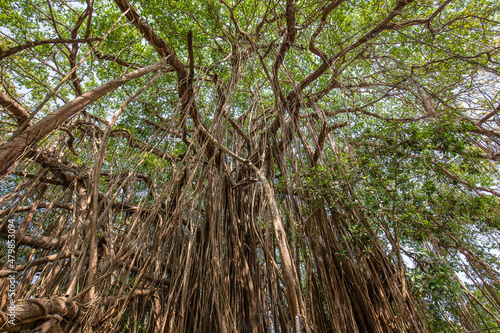 Fototapeta premium Old ancient Banyan tree with long roots that start at the top of the branches to the ground, India