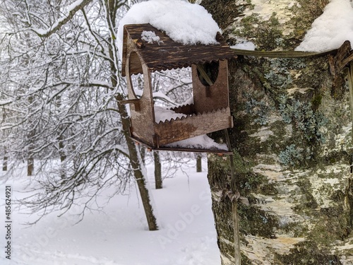 © Левон Мартиросян, Naklejka premium old and broken wooden birdhouse hanging on a tree in the park in the winter season covered with snow.