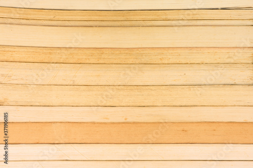 © wuttichok, Fototapeta premium Old and well used hardback books or text books on a shelf book or library. Many Books Piles.