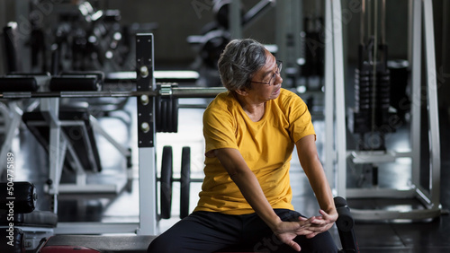© Blanscape, Fototapeta premium Old Asian fit man stretching arms and hands in fitness gym