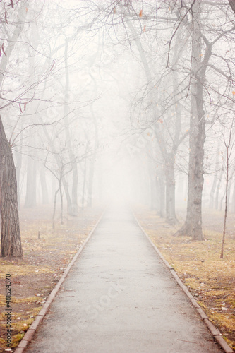 © Yekaterina, Naklejka premium Old asphalt road in autumn park with trees in the fog.
