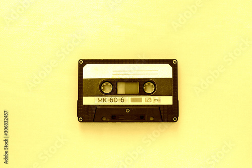 Obraz premium Old audio tape cassette, top view. Old technology concept. Yellow color toned