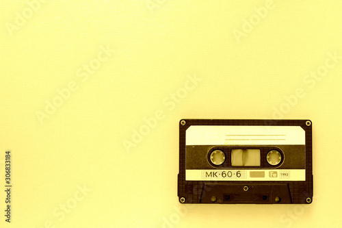 Obraz premium Old audio tape cassette, top view. Old technology concept. Yellow color toned