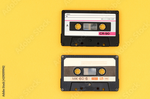 Obraz premium Old audio tape cassettes on a bright yellow background. Top view, old...