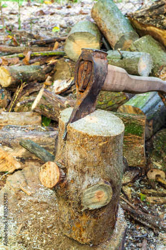 Fototapeta premium Old ax on wood log cooked before chopping. Preparation of firewood for winter