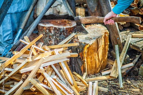 © Maxim, Obraz premium Old axe on the block of wood with pile of chopped logs lying on the ground. Axe impaled in tree stump.