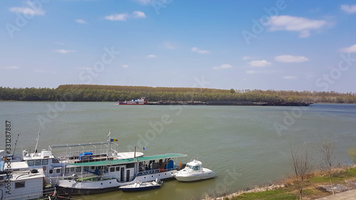 © ovidiu, Fototapeta premium old barge.cargo boat transporting old iron. industrial concept