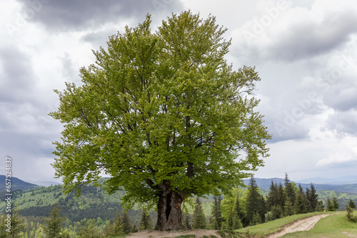 © An-T, Fototapeta premium Old beech on mountain meadow against the distant mountain ridges