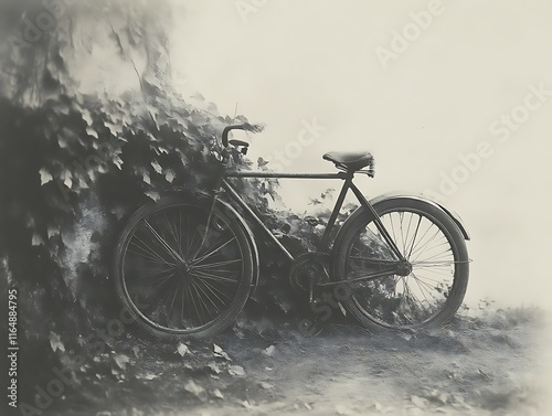 Obraz premium Old Bicycle Leaning Against Leafy Greenery