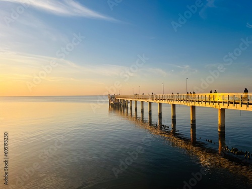 Fototapeta premium Old big pier at the sea, sunset seascape sky