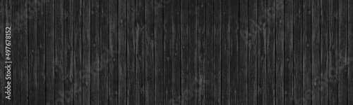 © JAYANNPO, Naklejka premium Old black knotted wooden board wide panoramic texture. Dark gray rough wood plank long backdrop. Large abstract background