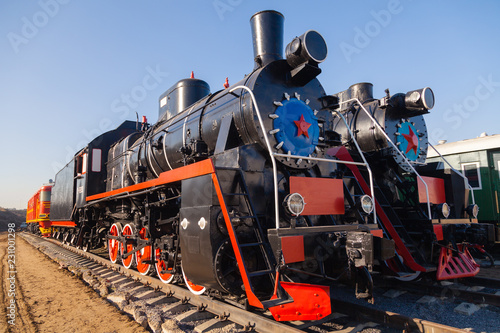 © Тимур Конев, Fototapeta premium Old black, white and red locomotive is standing on the rails in a railway museum against a blue sky. Concept of history, the carriage of passengers, transport